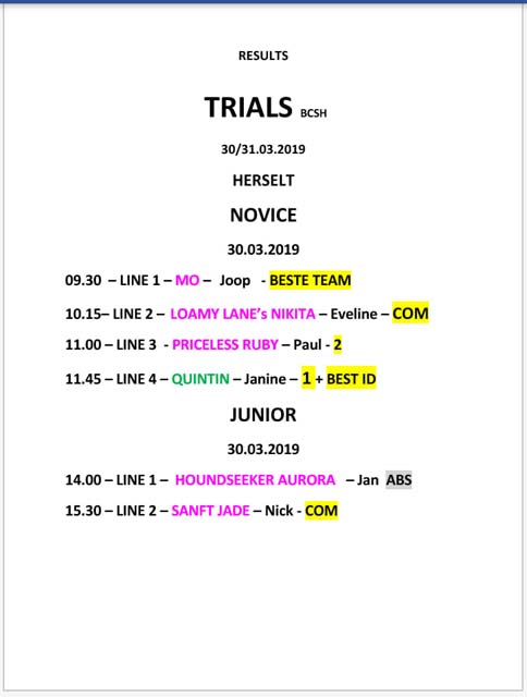 Trials Westerlo (BE) - 14 & 15/03/2015: Novice stake: ![]() Marguareth de la Meute d'Antan: 1ste prijs Sanft Chimer: identificatieprijs Junior stake: ![]() Sanft Daylight: 1ste prijs ![]() |